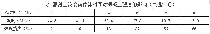 (6)在初凝時(shí)間內(nèi)的混凝土,由于氣溫較高、運(yùn)距較遠(yuǎn)、壓車時(shí)間較長(zhǎng)等造成混凝土坍落度損失較大,可通過(guò)試驗(yàn)添加同型號(hào)的泵送劑或減水劑,但添加與原先已加的總和摻量不能超過(guò)外加劑最大摻量的20%。應(yīng)逐漸添加,先少加,摻入后,攪拌運(yùn)輸車必須快速轉(zhuǎn)動(dòng)2min左右,測(cè)定坍落度符合要求。運(yùn)到現(xiàn)場(chǎng)的混凝土不能立即卸料,應(yīng)快速轉(zhuǎn)動(dòng)運(yùn)輸車2min后卸料,以確保坍落度和質(zhì)量。對(duì)超過(guò)初凝時(shí)間的混凝土應(yīng)廢棄,不能再使用。混凝土澆筑前停滯的時(shí)間越長(zhǎng),混凝土強(qiáng)度損失越嚴(yán)重(如表1),應(yīng)當(dāng)引起足夠重視。