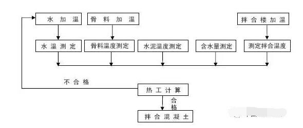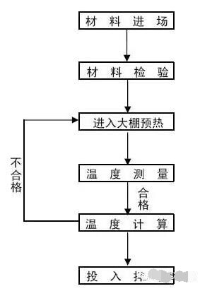 5.3根據(jù)計(jì)算結(jié)果進(jìn)行判定,若計(jì)算結(jié)果表明拌和后的混凝土溫度復(fù)核驗(yàn)標(biāo)要求,那么可立刻進(jìn)行混凝土拌和,若計(jì)算結(jié)果表明拌和后的溫度不能達(dá)到驗(yàn)標(biāo)要求,通過水加溫等手段提高各原材料溫度,重新進(jìn)入下一道工序。