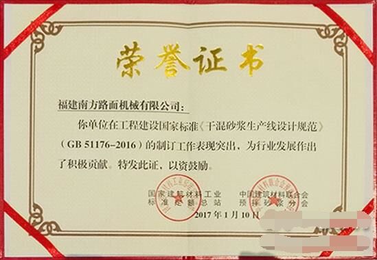 2017年1月10日,在2017'首屆中國國際預(yù)拌砂漿裝備技術(shù)研討會暨預(yù)拌砂漿綠色生產(chǎn)裝備及機械化施工技術(shù)峰會上,福建南方路面機械有限公司被中國建材聯(lián)合會預(yù)拌砂漿分會授予“中國預(yù)拌砂漿行業(yè)裝備制造培訓(xùn)基地”;同時,因在國家標(biāo)準(zhǔn)GB51176-2016《干混砂漿生產(chǎn)線設(shè)計規(guī)范》編制工作中的特殊貢獻,被授予“特別貢獻單位”。