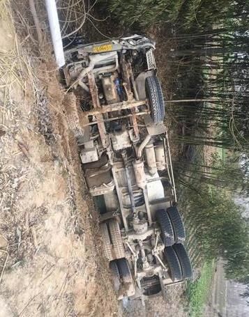 記者趕到現(xiàn)場從很遠(yuǎn)地方就可以看到一輛攪拌車橫躺在渠中,零部件散落一地,攪拌車有不同程度的受損。