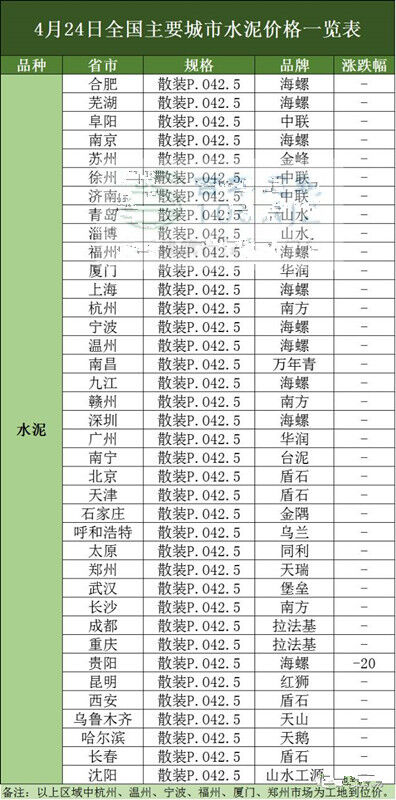 砼商網(wǎng)資源分享,4月24日全國(guó)主要城市水泥、混凝土、價(jià)格表。
