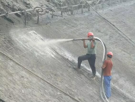 潮噴:是將骨料預(yù)加少量水,使之呈潮濕狀,再加水泥拌和,從而降低上料、拌和和噴射時的粉塵。但大量的水仍是在噴頭處加入和噴出的,其噴射工藝流程和使用機(jī)械同干噴工藝。目前施工現(xiàn)場較多使用的是潮噴工藝。