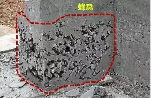 蜂窩有表面的、深井的和貫通的三種,也常遇到水平的、傾斜的、斜交的單獨(dú)蜂窩和相連的蜂窩群,其表現(xiàn)為局部表面酥松,無(wú)水泥漿,粗骨料外露深度大于5mm(小于混凝土保護(hù)層厚度),石子間存在小于最大石子粒徑的空隙,呈蜂窩狀,有蜂窩處的混凝土強(qiáng)度很低。