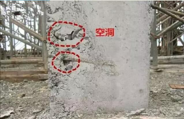 由于混凝土灌注時(shí)有一些部位堵塞不通,構(gòu)件中就會(huì)產(chǎn)生空洞,空洞不同與蜂窩,蜂窩的特征是存在于未搗實(shí)的混凝土或缺水泥漿;而空洞卻是局部或全部沒(méi)有混凝土??斩吹某叨韧ǔ]^大,以至于鋼筋全部裸露,造成構(gòu)件內(nèi)貫通的斷缺以至于結(jié)構(gòu)發(fā)生整體性破壞。