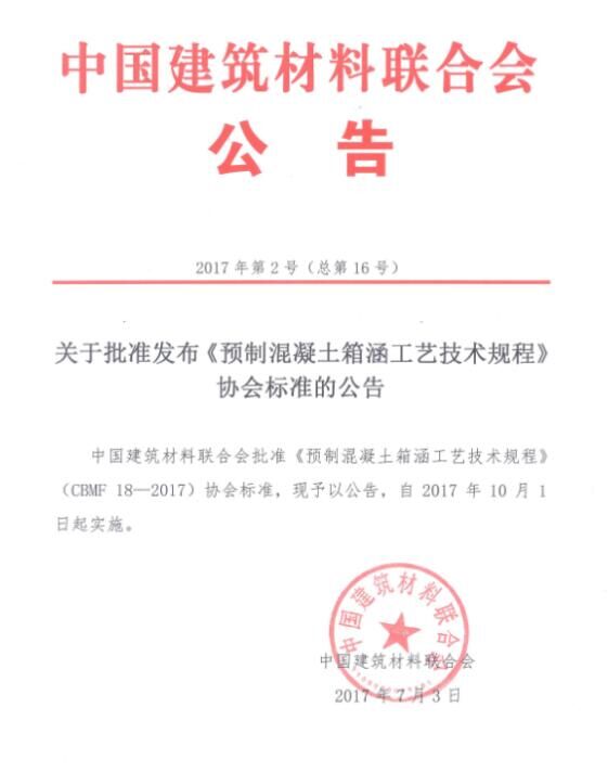 摘要:2017年7月,由中國混凝土與水泥制品協(xié)會(以下簡稱協(xié)會)組織制定的《預(yù)制混凝土箱涵工藝技術(shù)規(guī)程》和《混凝土用氧化鎂膨脹劑》兩項(xiàng)協(xié)會標(biāo)準(zhǔn),通過審定并發(fā)布批準(zhǔn)公告,標(biāo)準(zhǔn)號分別為CBMF 18-2017和CBMF 19-2017,將同時(shí)于2017年10月1日起實(shí)施。