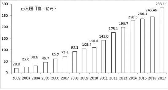 中國企業(yè)500強(qiáng)的入圍門檻及增幅(2002-2017)