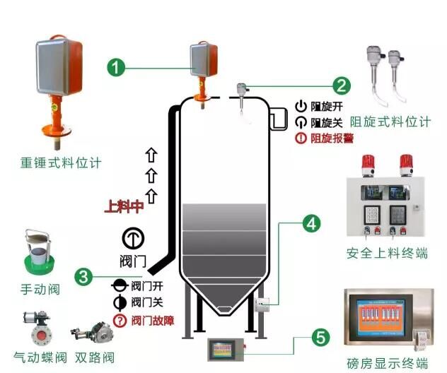 上料口側:安全上料控制終端、上料安全閥,每個料倉各1個,各個終端通過網(wǎng)絡連接。