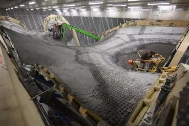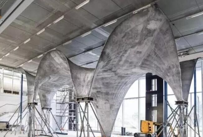 據(jù)了解,工程師們?cè)诖蛟爝^程中并沒有采用定制、一次性的木頭或泡沫支架,而是使用了他們自己設(shè)計(jì)的一種新技術(shù)。一張鋼索網(wǎng)被拉伸到想要的形狀,然后再在上面放置聚合織物形成一個(gè)靈活的模板。之后形狀可以通過算法控制,它能將力均勻地發(fā)布在各鋼索間并決定每個(gè)部分所需要的混凝土量。之后,鋼索網(wǎng)可以被拆掉、重復(fù)使用和重新調(diào)整。