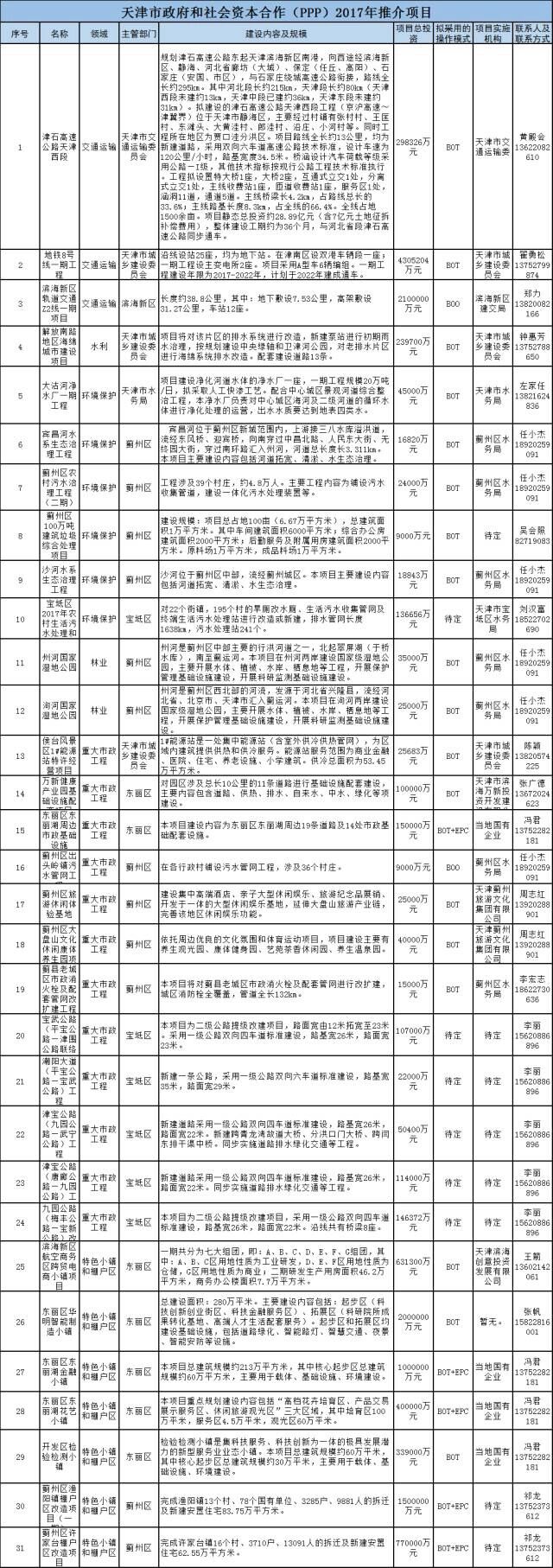 天津市發(fā)改委推介31個PPP項目,總投資1469億元,涉及交通運輸、水利、環(huán)境保護、林業(yè)、重大市政工程和特色小鎮(zhèn)及棚戶區(qū)六個領(lǐng)域,其中與基建相關(guān)的23個,投資超1438億元。