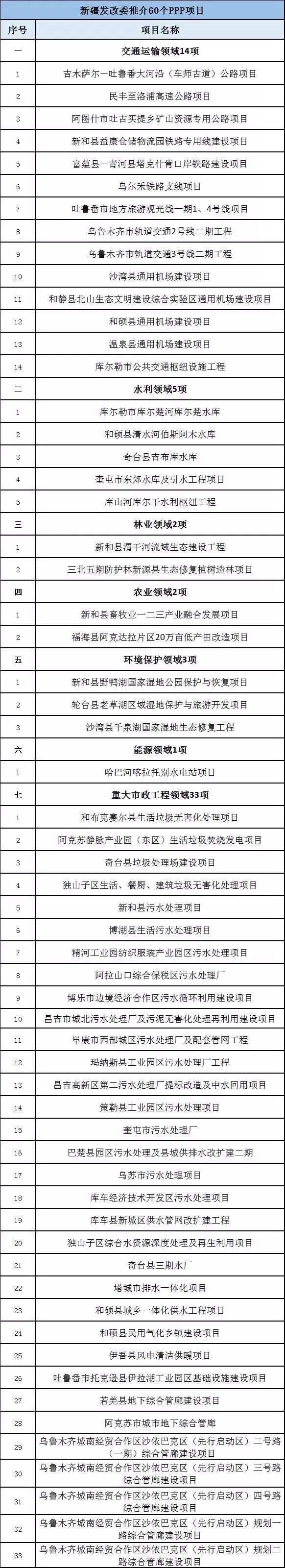 新疆維吾爾自治區(qū)發(fā)改委推介60個PPP項目,總投資559.12億元。包括:交通運輸領(lǐng)域項目14項,總投資368.2億元;水利領(lǐng)域項目5項,總投資40.58億元;林業(yè)領(lǐng)域項目2項,總投資4.6億元;農(nóng)業(yè)領(lǐng)域項目2項,總投資5.3億元;環(huán)境保護領(lǐng)域項目3項,總投資14.67億元;能源領(lǐng)域項目1項,總投資20.2億元;重大市政工程領(lǐng)域項目33項,總投資105.57億元。
