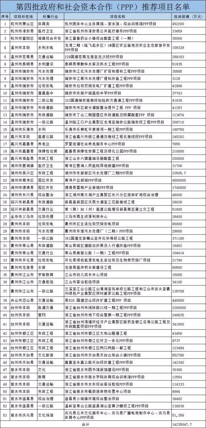 浙江省財政廳推薦53個PPP項目,總投資金額1424億元。