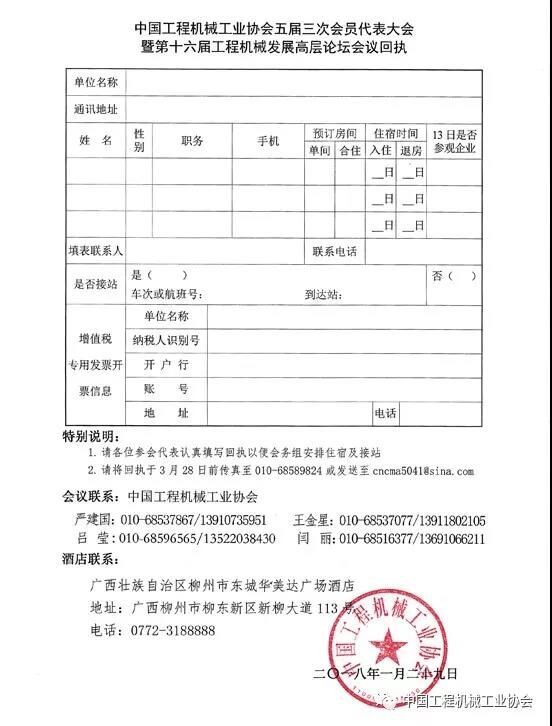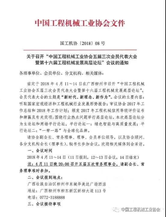 中國工程機(jī)械工業(yè)協(xié)會茲定于2018年4月11~14日在廣西柳州市召開“中國工程機(jī)械工業(yè)協(xié)會五屆三次會員代表大會暨第十六屆工程機(jī)械發(fā)展高層論壇”。會員代表大會的主題是“新時代、新理念、新作為”。