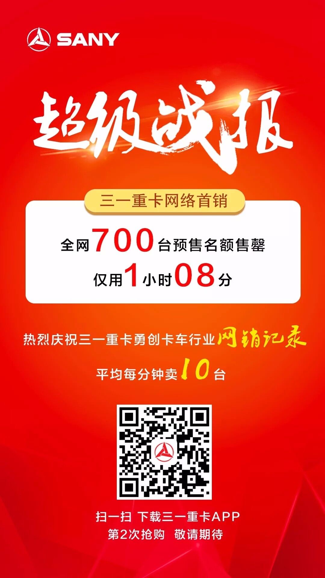 導語:2018年3月31日,三一重卡首批700臺預售名額在網絡上鳴鑼開賣,僅用1小時8分鐘,700臺預售名額搶購一空,不僅開創(chuàng)了重卡廠家網絡直銷的先河,更是創(chuàng)造了重卡互聯(lián)網銷售臺數和總金額的雙重紀錄!