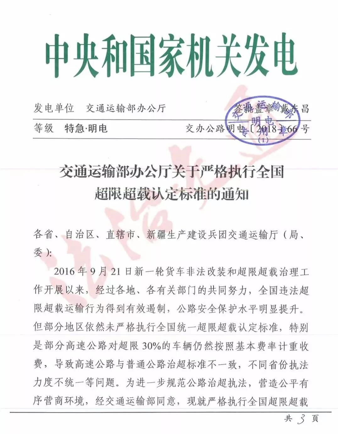 文件強(qiáng)調(diào):部分地區(qū)依然未嚴(yán)格執(zhí)行全國(guó)統(tǒng)一超限超載認(rèn)定標(biāo)準(zhǔn),部分高速公路對(duì)超限30%的車輛仍然按照基本費(fèi)率計(jì)重收費(fèi),導(dǎo)致高速公路與普通公路治超標(biāo)準(zhǔn)不一致,不同省份執(zhí)法力度不統(tǒng)一等問(wèn)題。未按標(biāo)準(zhǔn)執(zhí)行的地區(qū),9月底前全面整改。