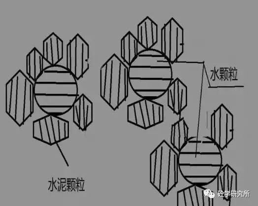 “水泥加水拌合后,由于這個水泥顆粒間的這個分子引力的作用,產生許絮狀物而形成絮狀結構,使30%或者到10%的這個半合水啊或者游離水被包裹在其中,從而降低 了混凝土拌合物的流動性”那么這段話是一個什么意思?呢咱們看這兩張圖。