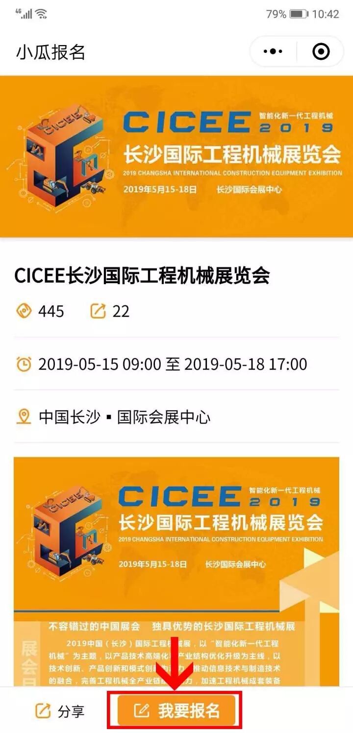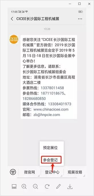 第1步,掃碼關(guān)注“CICEE長沙國際工程機(jī)械展”微信公眾號,點擊“參會登記”,獲取小程序二維碼。