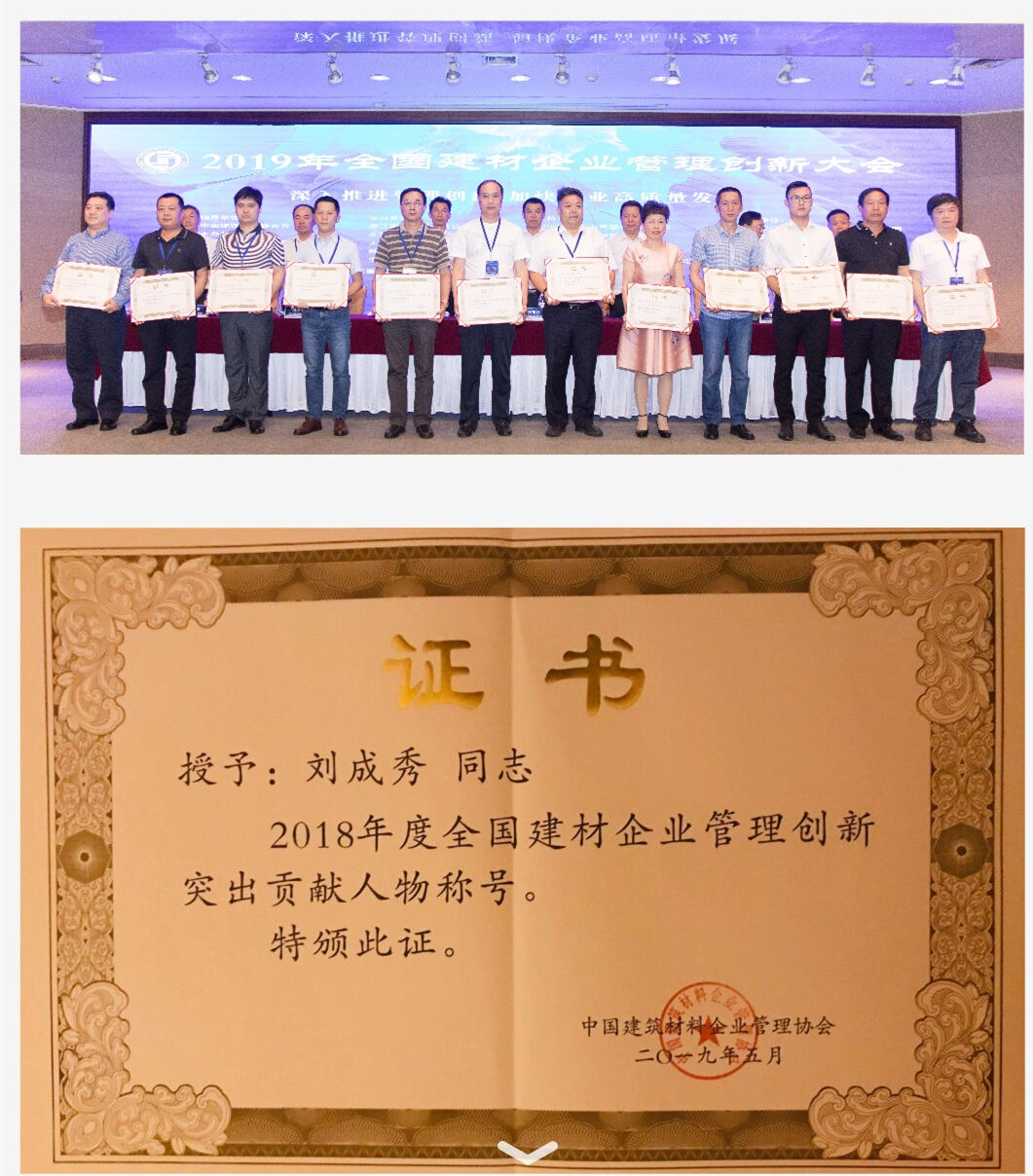 為深入學習貫徹習近平新時代中國特色社會主義思想和 黨的十九大精神,落實《中共中央、國務院關于營造企業(yè)家健康成長環(huán)境弘揚優(yōu)秀企業(yè)家精神更好發(fā)揮企業(yè)家作用的意見》 (中發(fā)〔2017〕25 號),深入實施工業(yè)和信息化部等 11 部委 聯(lián)合下發(fā)的《關于引導企業(yè)創(chuàng)新管理提質增效的指導意見》(工信部聯(lián)產(chǎn)業(yè)〔2016〕245 號),進一步推動建材企業(yè)高質量發(fā)展,促進企業(yè)轉型升級和提質增效,中國建筑材料企業(yè)管理協(xié)會于 2018 年 12 月~2019 年 4 月開展了“2018 年度全國建材 企業(yè)管理現(xiàn)代化創(chuàng)新成果和管理創(chuàng)新突出貢獻人物”審定活動,歷時五個月,經(jīng)初審、終審,評選出百位全國建材行業(yè)優(yōu)秀企業(yè)家,其中中國工程機械協(xié)會混凝土機械分會成員—— 成都金瑞建工機械有限公司劉成秀董事長獲得“2018 年度全國建材企業(yè)管理創(chuàng)新突出貢獻人物”稱號!