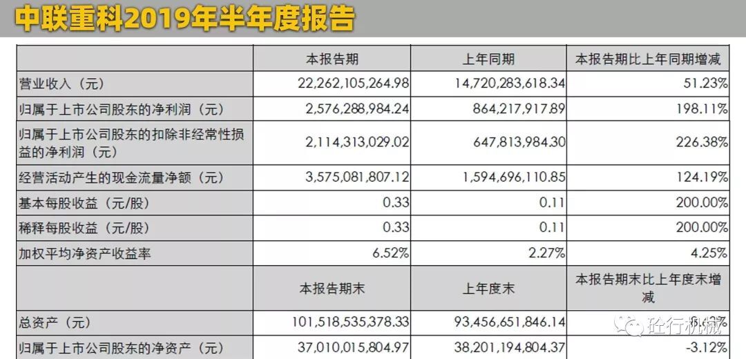 2019年上半年?duì)I業(yè)收入:222.62億元歸屬于上市公司股東凈利潤(rùn):25.76億元8月30日晚,中聯(lián)重科官方發(fā)布了2019年半年度報(bào)告。報(bào)告顯示,中聯(lián)重科上半年實(shí)現(xiàn)營(yíng)業(yè)總收入222.6億元,同比增長(zhǎng)51.23%;包括海外市場(chǎng)實(shí)現(xiàn)營(yíng)業(yè)收入16.84億元,同比增長(zhǎng)2.61%。歸屬于上市公司股東的凈利潤(rùn)25.76億元,同比增長(zhǎng)198.11%。相比較上面的徐工機(jī)械,雖然總營(yíng)業(yè)額相差了88個(gè)多億,但是,凈利潤(rùn)比徐工多了2.93億元。所以,從盈利能力來(lái)說(shuō),中聯(lián)表現(xiàn)比徐工要好。中聯(lián)重科的優(yōu)勢(shì)產(chǎn)業(yè)主要集中在混凝土機(jī)械、塔式起重機(jī)械、環(huán)衛(wèi)機(jī)械、農(nóng)業(yè)機(jī)械這四個(gè)領(lǐng)域?yàn)橹?,其中,建筑起重機(jī)械、長(zhǎng)臂架泵車(chē)保持行業(yè)第一,汽車(chē)起重機(jī)國(guó)內(nèi)市場(chǎng)份額較年初增長(zhǎng)6.8%。從目前中聯(lián)的發(fā)展趨勢(shì)來(lái)看,也在積極的擴(kuò)展高空作業(yè)平臺(tái)、土方機(jī)械、機(jī)制砂、干混砂漿、噴射機(jī)械手等新興業(yè)務(wù)。與此同時(shí),中聯(lián)重科目前也在積極轉(zhuǎn)型,打造人工智能和智能制造,中聯(lián)重科塔機(jī)智能工廠穩(wěn)步達(dá)產(chǎn),高空作業(yè)平臺(tái)臂式智能產(chǎn)線(xiàn)實(shí)現(xiàn)量產(chǎn),攪拌車(chē)智能制造產(chǎn)業(yè)園、液壓關(guān)鍵元件產(chǎn)業(yè)園處于規(guī)劃建設(shè)中。作為老牌的國(guó)產(chǎn)工程機(jī)械品牌,中聯(lián)重科一直以來(lái)?yè)碛泻芎玫钠放瓶诒貏e是在混凝土機(jī)械領(lǐng)域,擁有眾多的明星產(chǎn)品,碳纖維長(zhǎng)臂架泵車(chē),國(guó)內(nèi)首創(chuàng),大受市場(chǎng)歡迎。