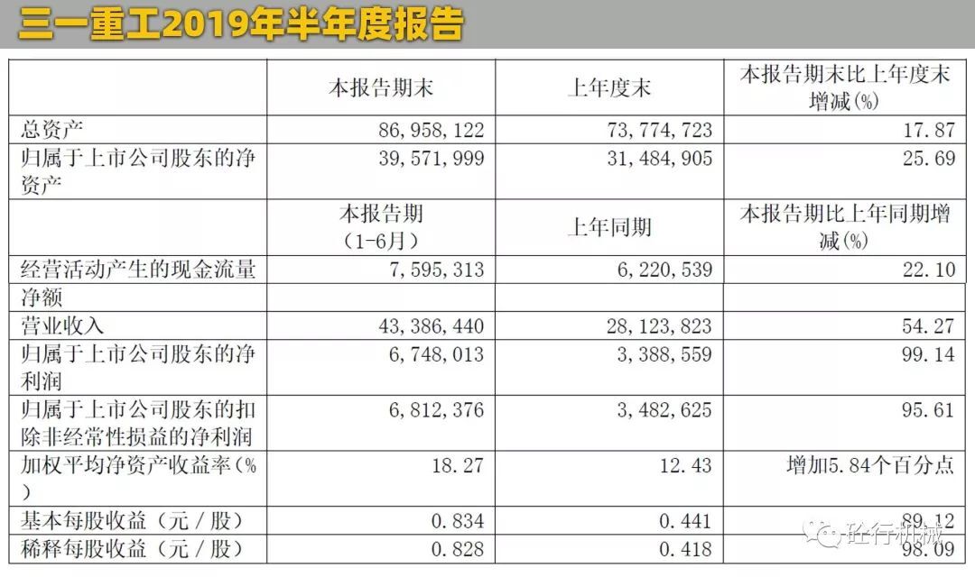8月29日晚,三一重工官方發(fā)布了其2019年上半年業(yè)績(jī)公告。上半年,公司實(shí)現(xiàn)營(yíng)業(yè)總收入433.86億元,同比增長(zhǎng)54.27%;包括三一國(guó)際銷(xiāo)售收入70.26億元,同比增長(zhǎng)15.34%。歸屬于上市公司股東的凈利潤(rùn)67.48億元,同比增長(zhǎng)99.14%。對(duì)比之下,不管是營(yíng)收能力,還是賺錢(qián)能力,三一重工都是最強(qiáng)的,凈利潤(rùn)更是比徐工和中聯(lián)凈利潤(rùn)的總和還要多將近一倍,民營(yíng)重工第一品牌當(dāng)之無(wú)愧。