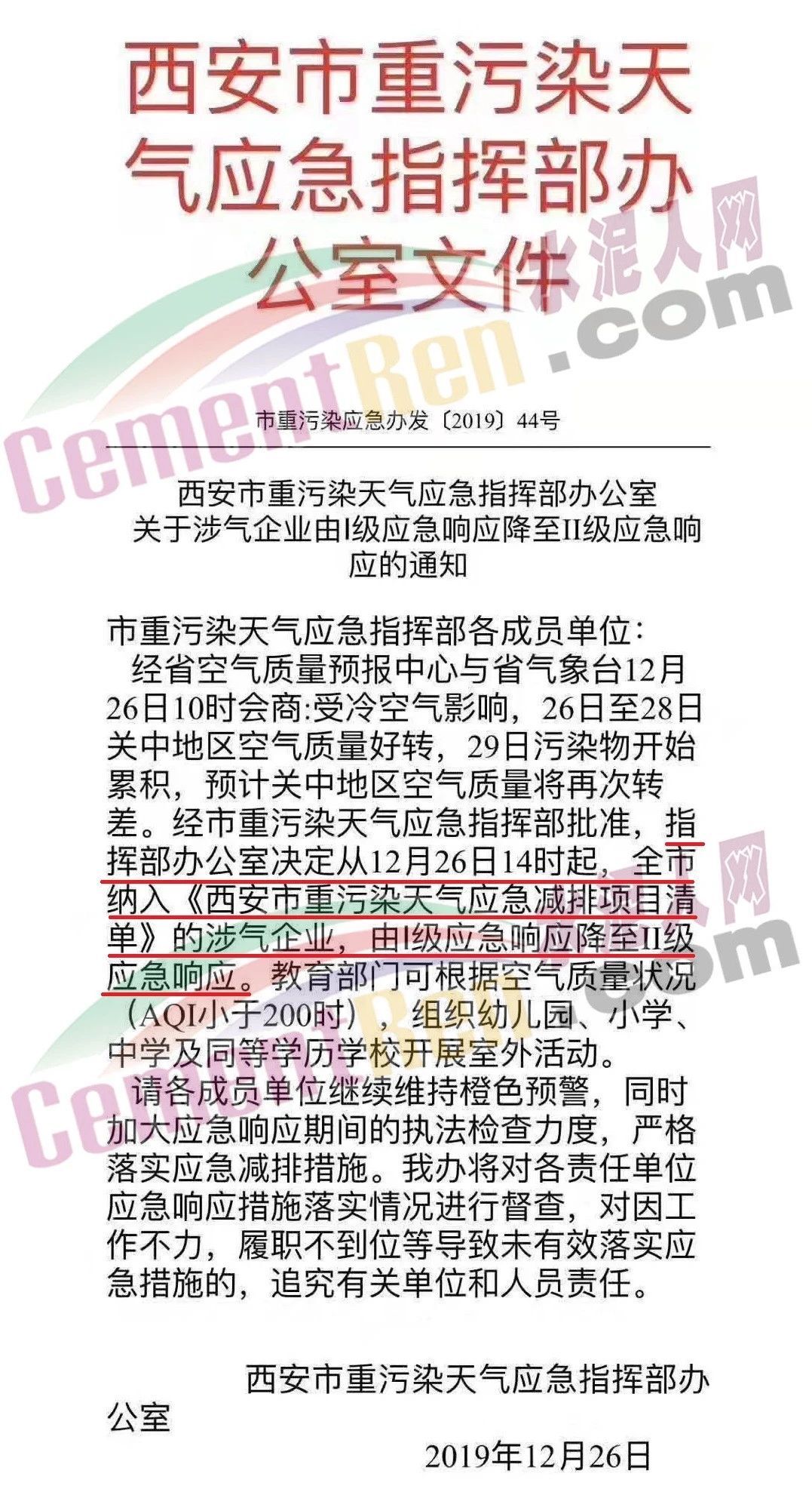 12月26日,陜西省西安市重污染天氣應(yīng)急指揮部辦公室發(fā)布了《關(guān)于涉氣企業(yè)由I級(jí)應(yīng)急響應(yīng)降至II級(jí)應(yīng)急響應(yīng)的通知》稱,西安市指揮部辦公室定于12月26日14時(shí)起,全西安市納入《西安市重污染天氣應(yīng)急減排項(xiàng)目清單》的涉氣企業(yè),由I級(jí)應(yīng)急響應(yīng)降至II級(jí)應(yīng)急響應(yīng)。通知原文如下: