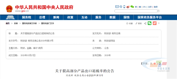 日前,中央人民政府網站發(fā)布了財政部、稅務總局聯合印發(fā)的關于提高部分產品出口退稅率的公告。本公告自2020年3月20日起實施。本公告所列貨物適用的出口退稅率,以出口貨物報關單上注明的出口日期界定。