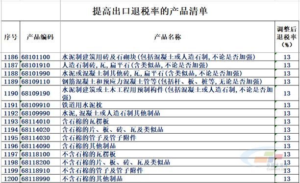 其中,水泥制建筑用磚及石砌塊(包括混凝土或人造石制,不論是否加強);水泥或混凝土制其他磚,瓦,扁平石(含類似品,不論是否加強);鋼筋混凝土和預應力混凝土管等(包括桿、板、樁等,無論是否加強);水泥制建筑或土木工程用預制構件(包括混凝土或人造石制,不論是否加強);鐵道用水泥枕;水泥,混凝土或人造石制其他制品等均被列入產品出口退稅清單中,且調整后退稅率均為13%。