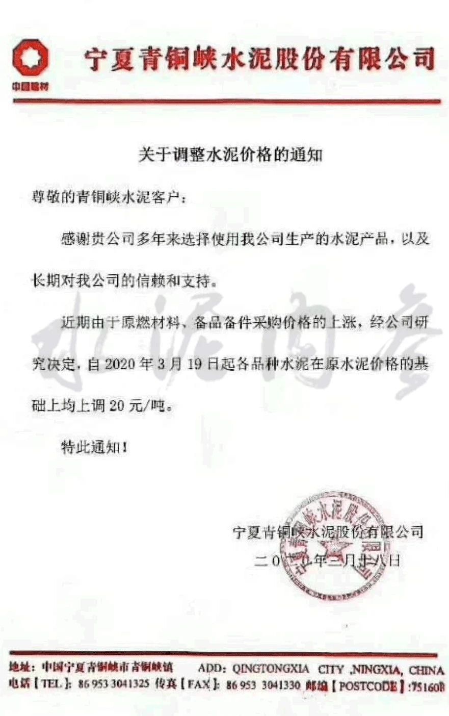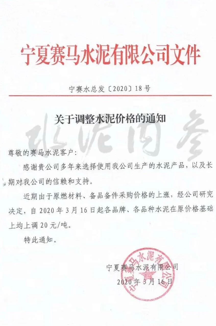 此前,寧夏賽馬水泥有限公司發(fā)布通知,稱(chēng)由于近期原燃料、備品備件采購(gòu)價(jià)格上漲,公司決定自3月16日起各品牌、各品種水泥在原有價(jià)格基礎(chǔ)上上調(diào)20元/噸。
