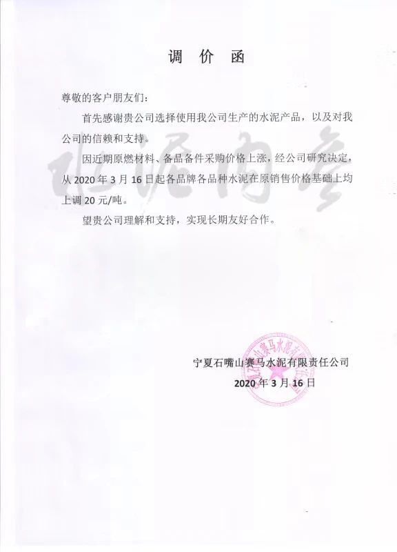寧夏石嘴山賽馬水泥有限公司發(fā)布通知,稱(chēng)由于近期原燃材料、備品備件采購(gòu)價(jià)格上漲,公司決定自3月16日起各品牌、各品種水泥在原有價(jià)格基礎(chǔ)上上調(diào)20元/噸。