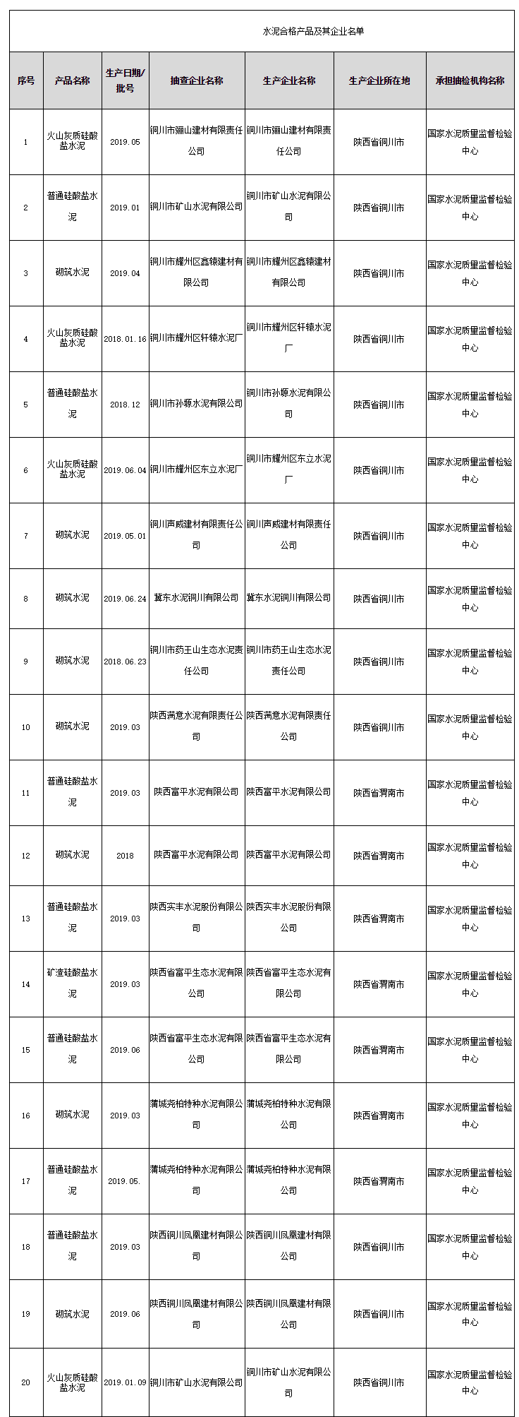 2020年3月31日,陜西省市場監(jiān)督管理局網(wǎng)站公布水泥產(chǎn)品質量監(jiān)督抽查結果。此次水泥產(chǎn)品在銅川、渭南等地的生產(chǎn)領域中抽取,共抽查生產(chǎn)企業(yè)15家,抽取樣品20批次,經(jīng)檢驗,合格樣品20批次。