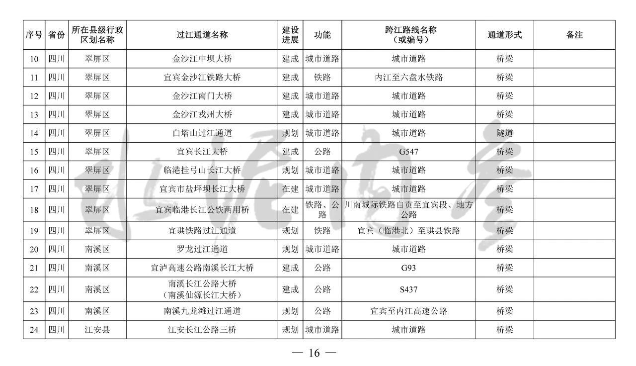 四川省(10座):雞翅膀大橋、臨港掛弓山長(zhǎng)江大橋、羅龍過(guò)江通道、納溪過(guò)江通道(大渡口長(zhǎng)江大橋)、安富第一過(guò)江通道(河?xùn)|長(zhǎng)江大橋)、瀘州藍(lán)田過(guò)江通道(長(zhǎng)江五橋)、瀘遵過(guò)江通道、新路口過(guò)江通道、合江新城過(guò)江通道(白沙長(zhǎng)江大橋)、榕山過(guò)江通道(榕山長(zhǎng)江大橋)