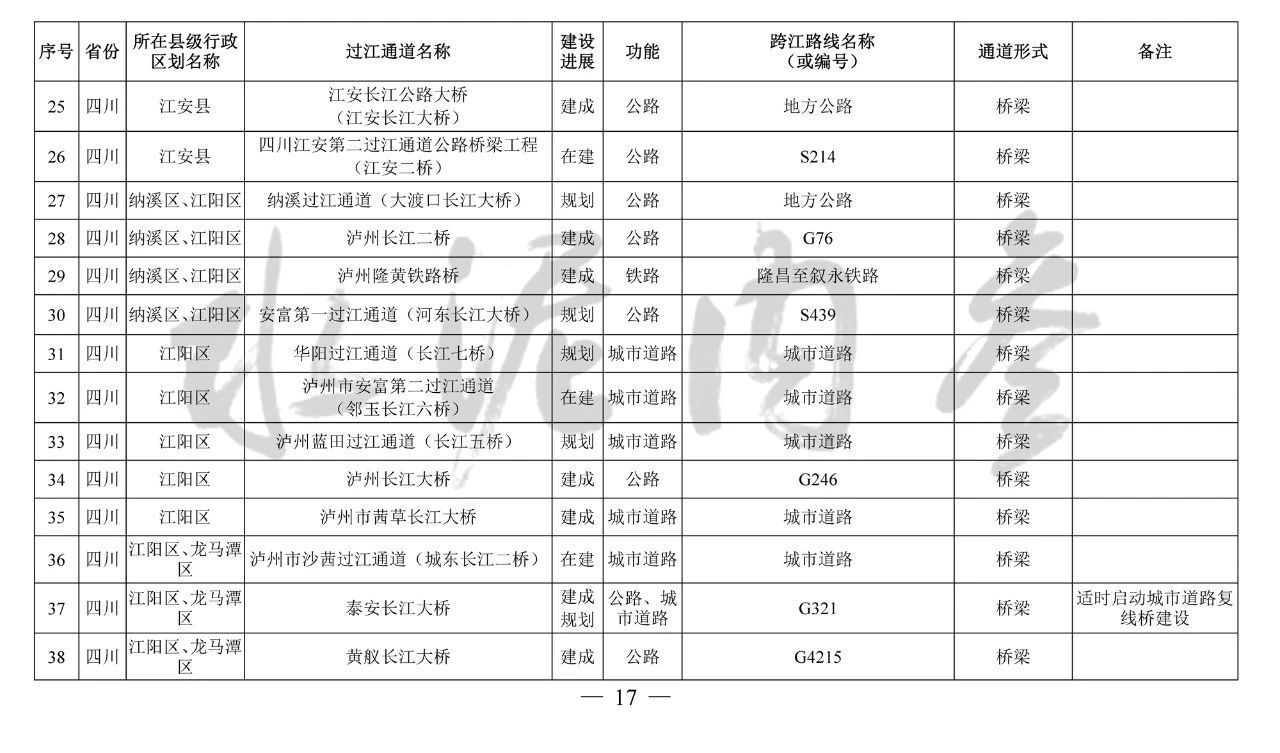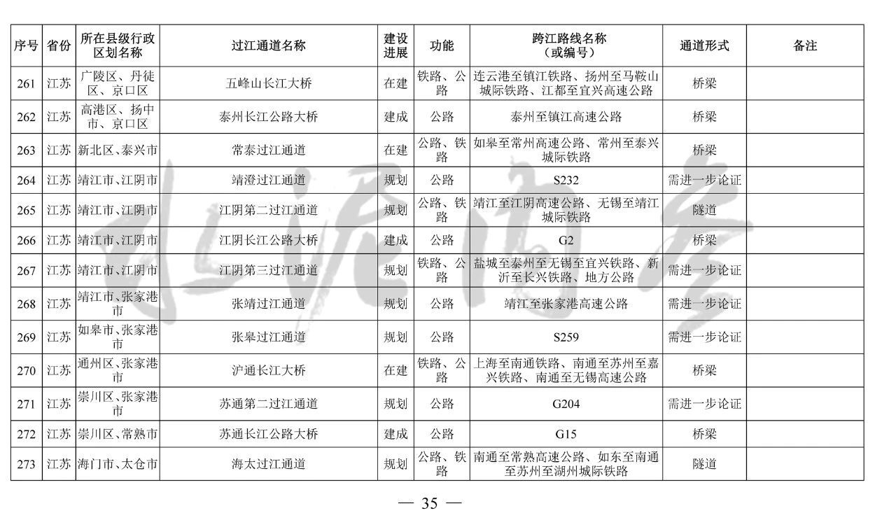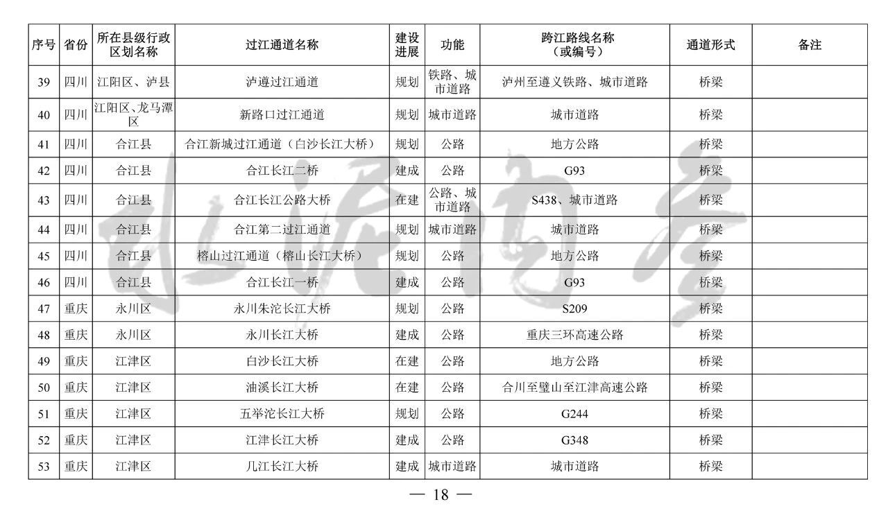 其中,到2035年規(guī)劃布局長(zhǎng)江干線過(guò)江通道276座,其中四川省45座、重慶市75座、湖北省69座、安徽省32座、江蘇省41座、上海市3座、滇川界1座、鄂湘界2座、鄂贛界6座、贛皖界2座。