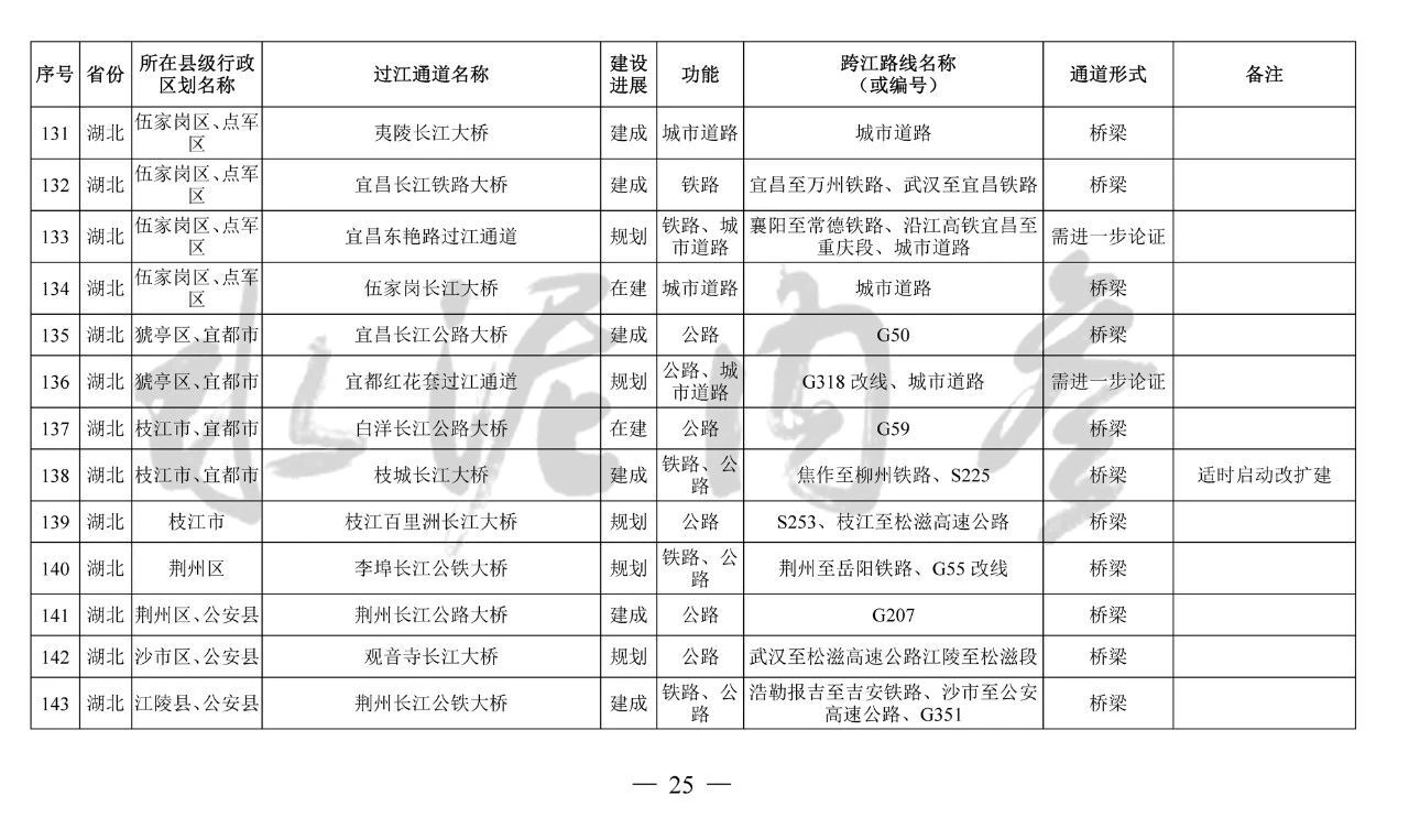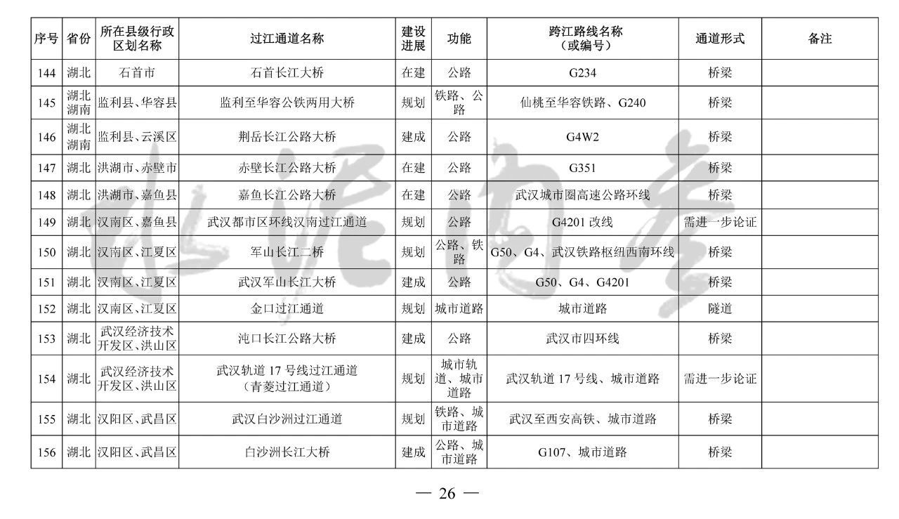 湖北?。?4座):巴東長(zhǎng)江公路二橋、興山至長(zhǎng)陽(yáng)高速公路過(guò)江通道、宜昌東艷路過(guò)江通道、宜都紅花套過(guò)江通道、枝江百里洲長(zhǎng)江大橋、李埠長(zhǎng)江公鐵大橋、觀音寺長(zhǎng)江大橋、武漢都市區(qū)環(huán)線漢南過(guò)江通道、軍山長(zhǎng)江二橋、武漢軌道17號(hào)線過(guò)江通道(青菱過(guò)江通道)、武漢白沙洲過(guò)江通道、武漢軌道12號(hào)線白沙洲過(guò)江通道、武漢軌道11號(hào)線三期漢陽(yáng)段過(guò)江通道、武漢軌道13號(hào)線過(guò)江通道(小東門過(guò)江通道)、二七路過(guò)江通道、武漢軌道10號(hào)線二七過(guò)江通道、武漢軌道12號(hào)線丹水池過(guò)江通道、堤角過(guò)江通道、武漢軌道20號(hào)線過(guò)江通道、武漢軌道25號(hào)線過(guò)江通道(長(zhǎng)江新城過(guò)江通道)、武漢軌道新港線陽(yáng)邏過(guò)江通道、光谷過(guò)江通道、新港高速雙柳長(zhǎng)江大橋、鄂黃第二過(guò)江通道鄂湘界(1座):監(jiān)利至華容公鐵兩用大橋