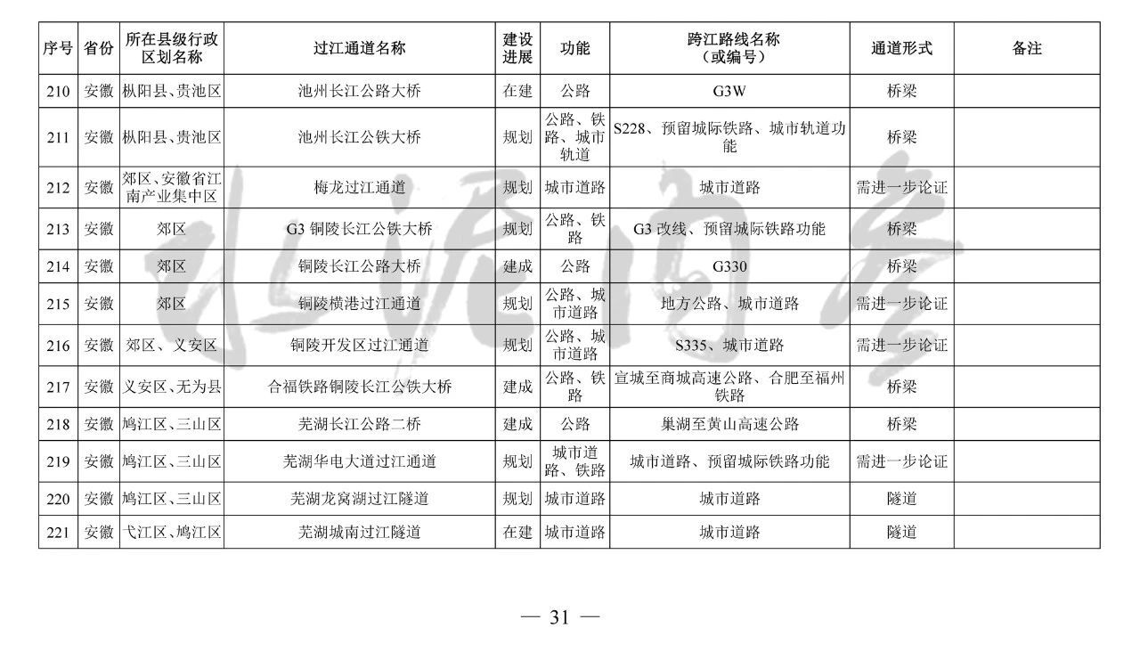 安徽?。?座):望江長(zhǎng)江公鐵大橋、安慶海口長(zhǎng)江公路大橋、池州長(zhǎng)江公鐵大橋、G3銅陵長(zhǎng)江公鐵大橋、銅陵開(kāi)發(fā)區(qū)過(guò)江通道、蕪湖北京路過(guò)江隧道、蕪湖泰山路長(zhǎng)江公鐵大橋、馬鞍山長(zhǎng)江公鐵大橋、馬鞍山九華路過(guò)江通道