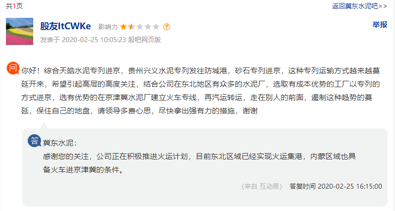 日前有股友在上市公司平臺向冀東水泥提問并建議:稱綜合天皓水泥專列進(jìn)京,貴州興義水泥專列發(fā)往防城港,砂石專列進(jìn)京,這種專列運輸方式越來越蔓延開來,希望引起高層的高度關(guān)注。