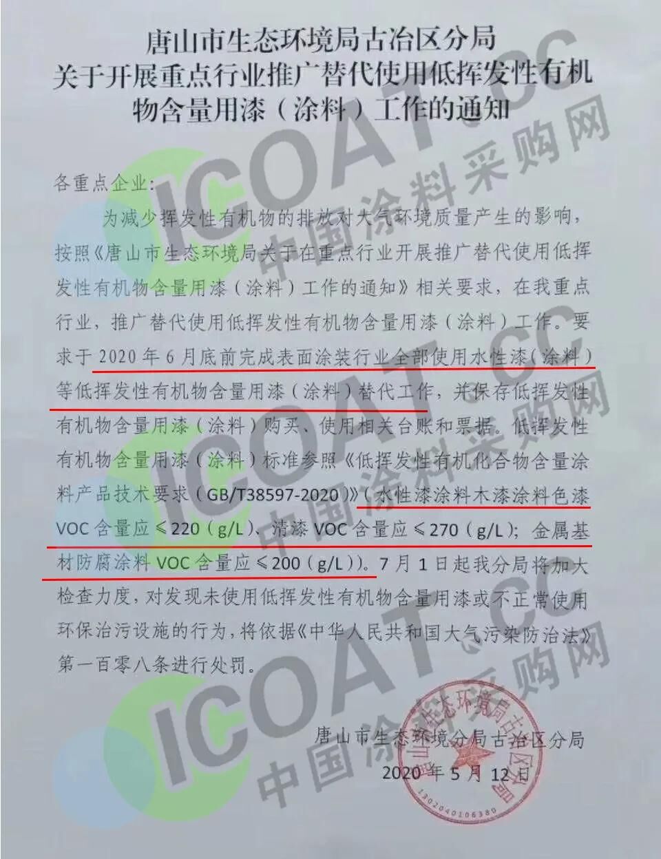 為減少揮發(fā)性有機(jī)物的排放對(duì)大氣環(huán)境質(zhì)量產(chǎn)生的影響,按照《唐山市生態(tài)環(huán)境局關(guān)于在重點(diǎn)行業(yè)開(kāi)展推廣替代使用低揮發(fā)性有機(jī)物含量用漆(涂料)工作的通知》相關(guān)要求,在我重點(diǎn)行業(yè),推廣替代使用低揮發(fā)性有機(jī)物含量用漆(涂料)工作,要求于2020年6月底前完成表面涂裝行業(yè)全部使用水性漆(涂料)等低揮發(fā)性有機(jī)物含量用漆(涂料)替代工作,并保存低揮發(fā)性有機(jī)物含量用漆(涂料)購(gòu)買(mǎi)、使用相關(guān)臺(tái)賬和票據(jù)。低揮發(fā)性有機(jī)物含量用漆(涂料)標(biāo)準(zhǔn)參照《低揮發(fā)性有機(jī)化合物含量涂料產(chǎn)品技術(shù)要求(GB/T38597-2020)》(水性漆涂料木漆涂料色漆VOC含量應(yīng)≤220(g/L)、清漆VOC含量應(yīng)≤270(g/L);金屬基材防腐涂料VOC含量應(yīng)≤200(g/L))。 7月1日起我分局將加大檢查力度,對(duì)發(fā)現(xiàn)未使用低揮發(fā)性有機(jī)物含量用漆或不正常使用環(huán)保治污設(shè)施的行為,將依據(jù)《中華人民共和國(guó)大氣污染防治法》第一百零八條進(jìn)行處罰。附:《中華人民共和國(guó)大氣污染防治法》第一百零八條??違反本法規(guī)定,有下列行為之一的,由縣級(jí)以上人民政府生態(tài)環(huán)境主管部門(mén)責(zé)令改正,處二萬(wàn)元以上二十萬(wàn)元以下的罰款;拒不改正的,責(zé)令停產(chǎn)整治:(一)產(chǎn)生含揮發(fā)性有機(jī)物廢氣的生產(chǎn)和服務(wù)活動(dòng),未在密閉空間或者設(shè)備中進(jìn)行,未按照規(guī)定安裝、使用污染防治設(shè)施,或者未采取減少?gòu)U氣排放措施的;(二)工業(yè)涂裝企業(yè)未使用低揮發(fā)性有機(jī)物含量涂料或者未建立、保存臺(tái)賬的;(三)石油、化工以及其他生產(chǎn)和使用有機(jī)溶劑的企業(yè),未采取措施對(duì)管道、設(shè)備進(jìn)行日常維護(hù)、維修,減少物料泄漏或者對(duì)泄漏的物料未及時(shí)收集處理的;(四)儲(chǔ)油儲(chǔ)氣庫(kù)、加油加氣站和油罐車(chē)、氣罐車(chē)等,未按照國(guó)家有關(guān)規(guī)定安裝并正常使用油氣回收裝置的;(五)鋼鐵、建材、有色金屬、石油、化工、制藥、礦產(chǎn)開(kāi)采等企業(yè),未采取集中收集處理、密閉、圍擋、遮蓋、清掃、灑水等措施,控制、減少粉塵和氣態(tài)污染物排放的;(六)工業(yè)生產(chǎn)、垃圾填埋或者其他活動(dòng)中產(chǎn)生的可燃性氣體未回收利用,不具備回收利用條件未進(jìn)行防治污染處理,或者可燃性氣體回收利用裝置不能正常作業(yè),未及時(shí)修復(fù)或者更新的。
