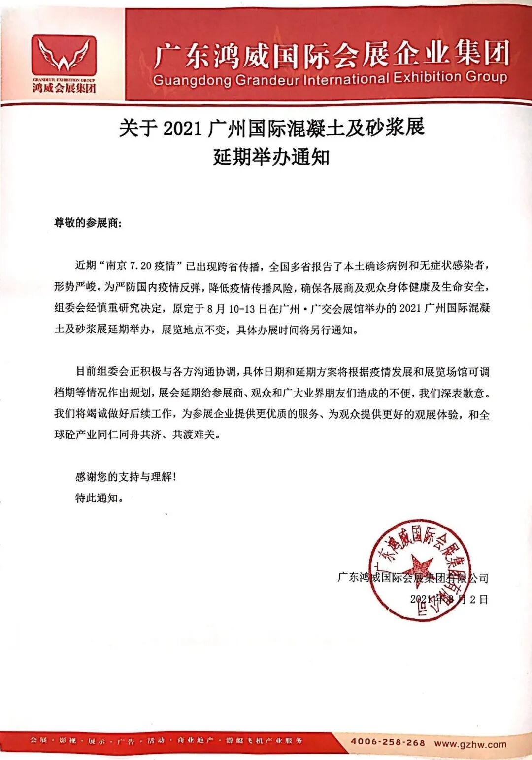 由于當前國內(nèi)多地出現(xiàn)新型冠狀病毒肺炎新增確診病例、中高風險地區(qū)不斷增加的疫情嚴峻形勢影響,為全力配合做好疫情防控工作,避免大規(guī)模聚集和降低疫情傳播風險,保障參展商、觀眾及工作人員健康安全,維護參展單位權益,確保展會效果,組委會經(jīng)慎重研究決定,原定于8月10-13日在廣州·廣交會展館舉辦的2021廣州國際混凝土及砂漿展延期舉辦,展覽地點不變,具體辦展時間將另行通知。