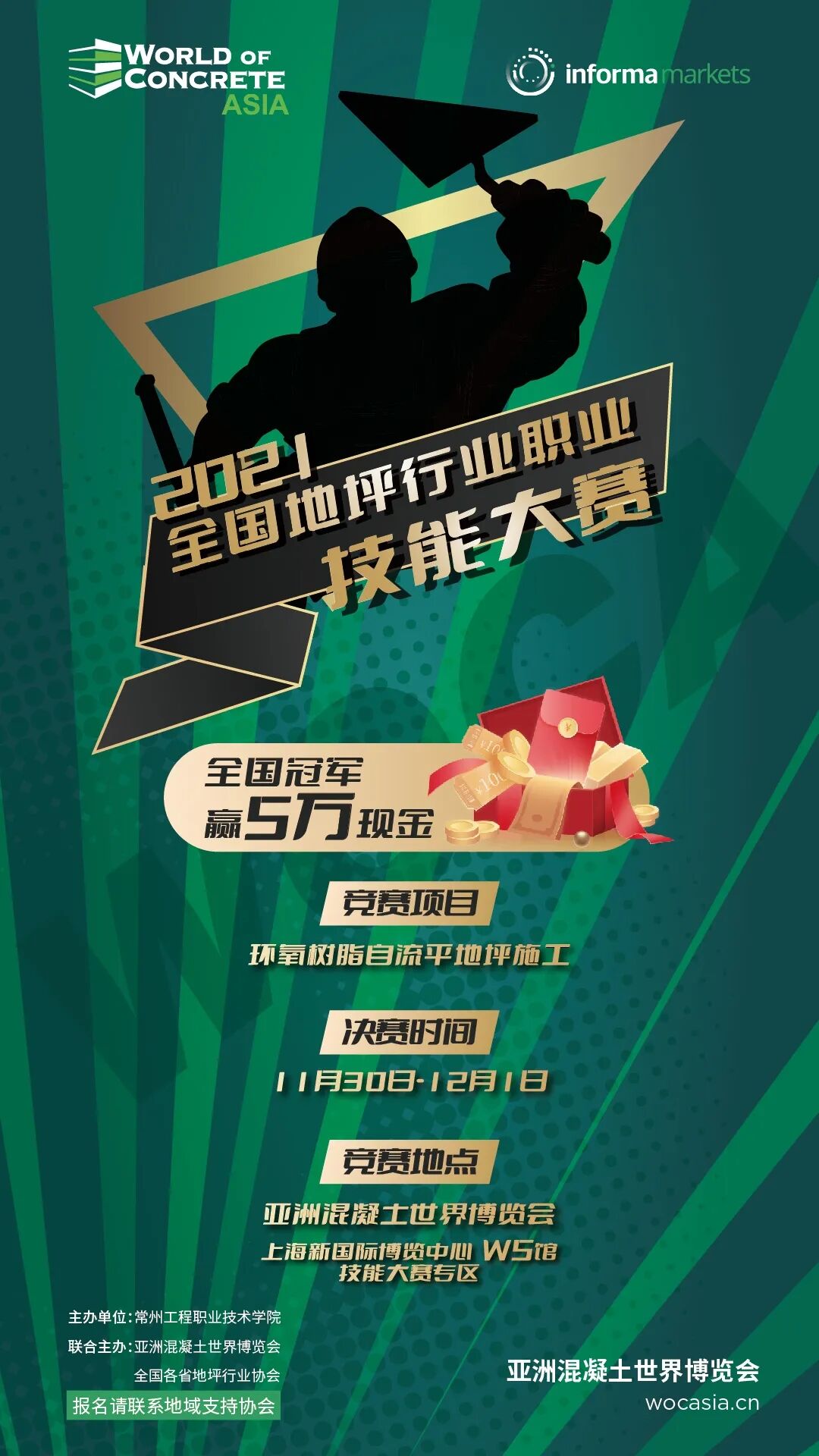 由常州工程職業(yè)技術(shù)學(xué)院、WOCA亞洲混凝土世界博覽會(huì)聯(lián)合主辦,地坪產(chǎn)業(yè)學(xué)院和各省地坪行業(yè)協(xié)會(huì)協(xié)辦的“2021年全國(guó)地坪行業(yè)職業(yè)技能大賽”,將在2021年亞洲混凝土世界博覽會(huì)展會(huì)現(xiàn)場(chǎng)舉行,全國(guó)冠軍將獲得五萬現(xiàn)金!