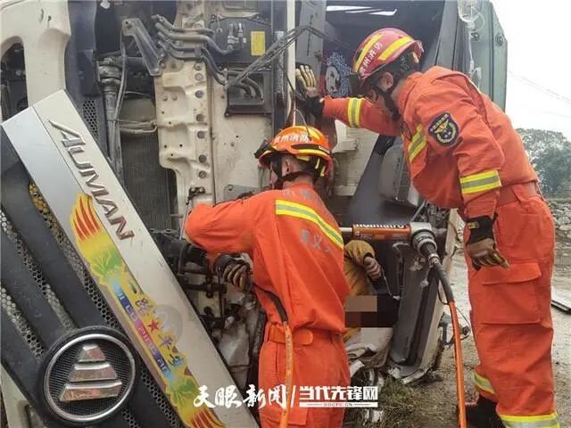 到達(dá)現(xiàn)場(chǎng)后,指揮員立即下車對(duì)現(xiàn)場(chǎng)情況進(jìn)行偵查,發(fā)現(xiàn)事故車輛是一臺(tái)裝滿了35噸混凝土的罐車,由于雨天路滑,司機(jī)行駛到一段下坡路時(shí)因操作不當(dāng)發(fā)生側(cè)翻。駕駛員被困在駕駛室內(nèi),駕駛室已嚴(yán)重變形,無(wú)法將車門正常開啟,現(xiàn)場(chǎng)醫(yī)護(hù)人員正為司機(jī)輸液補(bǔ)充能量。