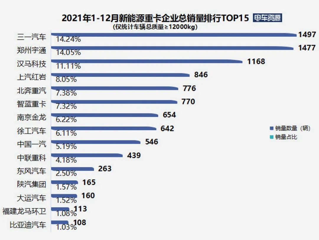 特別是在企業(yè)銷量排行榜上,表現(xiàn)最為搶眼的并不是傳統(tǒng)重卡制造商,而是工程機械企業(yè)跨行業(yè)進軍重卡行業(yè)的典型代表——三一汽車與徐工汽車:三一新能源重卡2021年累計銷量達到1497輛,同比大增1621%,市場份額達到14.33%,較上年同期提升了11個百分點;徐工在2022年1月21.2%的月度占有率火熱開局,問鼎新能源重卡2022首月銷冠。