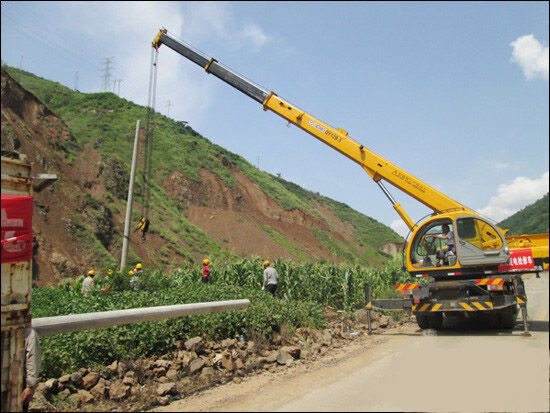 筆者連線徐工起重機事業(yè)部駐云南辦事處卞泳主任,他介紹了相關情況。8月7日上午,魯?shù)榭h城通往震中龍頭山鎮(zhèn)的道路經過兩日的搶修和交通管制已基本暢通,武警交通部隊決定允許放行小型汽車起重機。指揮部要求南方電網公司迅速完成龍頭山鎮(zhèn)幾處電線桿及變壓設備的安裝。南方電網公司考慮道路情況惡劣,決定征用一直等候在交通管制境界線之外的一臺徐工QY12B.5汽車起重機,徐工12噸起重機迅速到達現(xiàn)場投入搶修。