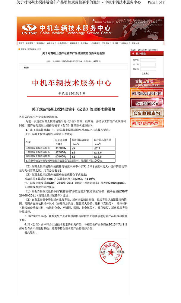 根椐國(guó)家有關(guān)依法治國(guó)的精神,嚴(yán)格執(zhí)行國(guó)家法律、標(biāo)準(zhǔn)的有關(guān)規(guī)定,中機(jī)車輛技術(shù)服務(wù)中心根據(jù)中國(guó)工業(yè)信息化部產(chǎn)業(yè)政策司意見,印發(fā)中機(jī)函[2015]7號(hào)文向相關(guān)單位下發(fā)。此文明確了混凝土攪拌運(yùn)輸車三點(diǎn)技術(shù)要求(原文見附件),并于2015年7月1日前對(duì)公告產(chǎn)品進(jìn)行整改,逾期者將暫仃公告。椐此,特向全國(guó)廣大攪拌運(yùn)輸車生產(chǎn)商和使用者予以提示,希望大家認(rèn)真嚴(yán)格執(zhí)行。