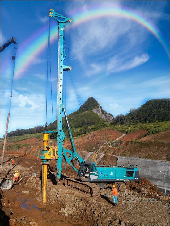面對復(fù)雜的地質(zhì)情況及施工條件,而工程承包方施工建設(shè)多集中在水壩、水電站、公路等領(lǐng)域,旋挖樁基礎(chǔ)施工涉及不多,經(jīng)驗有限。加之毛里求斯島國物資缺乏、施工周期緊,山河智能現(xiàn)場服務(wù)人員與公司總部日夜緊急聯(lián)動,及時調(diào)整作業(yè)方式,采取分段施工、埋深護筒等方法,定制成套施工解決方案,憑借公司