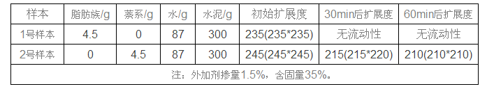 為了初步判斷這兩種外加劑對海螺牌水泥的適應(yīng)性問題,首先調(diào)和成同樣固含量為的溶液,實驗數(shù)據(jù)詳見表1: