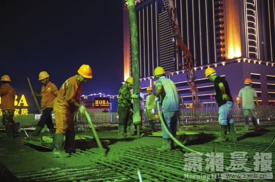 8月15日晚8時(shí),長(zhǎng)沙萬家麗廣場(chǎng)對(duì)面,一輛水泥罐車開進(jìn)萬家麗路與荷花路交會(huì)處東南角。接著這輛罐車伸出高高的手臂,連續(xù)不斷地向萬家麗路高架輸送預(yù)拌混凝土,數(shù)十名工程技術(shù)人員在綁扎好鋼筋的最后一跨箱梁上嫻熟操作。上海城建市政集團(tuán)萬家麗路快速化改造工程項(xiàng)目副總指揮、項(xiàng)目經(jīng)理傅建平透露,15日晚8時(shí)至16日上午10時(shí),十名工程技術(shù)人員要完成120米橋面混凝土澆筑,到16日上午10時(shí),萬家麗路快速化高架主線結(jié)構(gòu)全面貫通。今年國(guó)慶節(jié),作為湖南長(zhǎng)沙乃至湖南首條按照快速化改造的高架橋,將實(shí)現(xiàn)全面竣工通車。