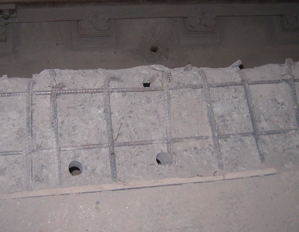 鑿除孔洞周圍松散混凝土,用高壓水沖洗干凈,立模后用高一強(qiáng)度等級(jí)的細(xì)石混凝土仔細(xì)澆筑搗固。
