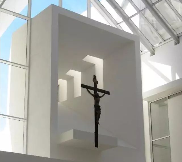 理查德·邁耶作品。教堂高57~90尺不等,如船帆狀的三片白色弧墻,層次井然地朝垂直與水平雙向彎曲,似球狀的白色弧墻曲面。建筑材料包括混凝土、石灰華和玻璃。三座大型的混凝土翹殼高度從56英尺逐步上升到88英尺,看上去像白色的風(fēng)帆。玻璃屋頂和天窗讓自然光線傾瀉而下。夜晚,教堂的燈光營(yíng)造出一份天國(guó)的景觀。