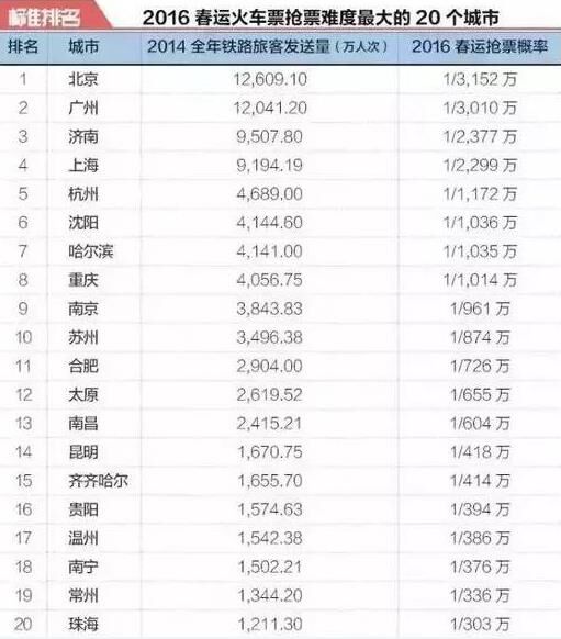 為了更直觀地反映春運(yùn)火車票的購(gòu)票難度,我們用全年旅客發(fā)送量轉(zhuǎn)換成“搶票概率”,比如說,北京全年旅客發(fā)送量是1.2億人次,那你每次買票的成功概率就是1.2億分之一。那么,春運(yùn)旅客發(fā)送量如何計(jì)算?春運(yùn)一般為期40天,而且集中度很高,根據(jù)我們的評(píng)估,期間的量相當(dāng)于平時(shí)的3倍,比如,北京春運(yùn)火車旅客發(fā)送量是“12609.10萬人次÷12個(gè)月x3倍=3152萬人次”。這個(gè)數(shù)據(jù),與鐵路部門公布的2015北京春運(yùn)火車旅客發(fā)送量(2796.2萬人次)非常接近,我們認(rèn)為還是非??孔V的。這樣,北京地區(qū)春運(yùn)火車票搶票概率就是1/3152萬。概率越低,搶票的難度越大。