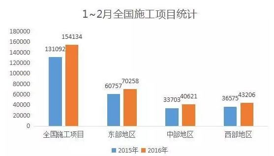 今年1~2月,全國施工項(xiàng)目154134個(gè),比去年同期增加23042個(gè)。其中,東部地區(qū)施工項(xiàng)目70258個(gè),增加9501個(gè);中部地區(qū)施工項(xiàng)目40621個(gè),增加6918個(gè);西部地區(qū)施工項(xiàng)目43206個(gè),增加6631個(gè)。
