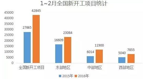 今年1~2月,全國新開工項(xiàng)目42845個(gè),比去年增加15180個(gè)。其中,東部地區(qū)新開工項(xiàng)目23084個(gè),增加6475個(gè);中部地區(qū)新開工項(xiàng)目11900個(gè),增加5886個(gè);西部地區(qū)新開工項(xiàng)目7855個(gè),增加2815個(gè)。