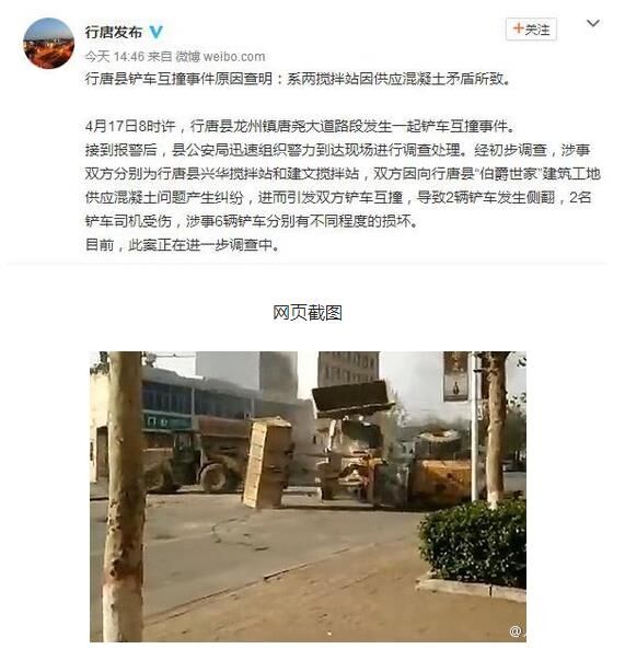 17日8時許,行唐縣發(fā)生鏟車互撞事件。經(jīng)警方初步調(diào)查,涉事雙方為行唐縣兩攪拌站,因向某建筑工地供應混凝土問題產(chǎn)生糾紛,進而沖突。致2輛鏟車發(fā)生側(cè)翻,2名鏟車司機受傷,涉事6輛鏟車分別有不同程度的損壞。該案還在進一步調(diào)查中。